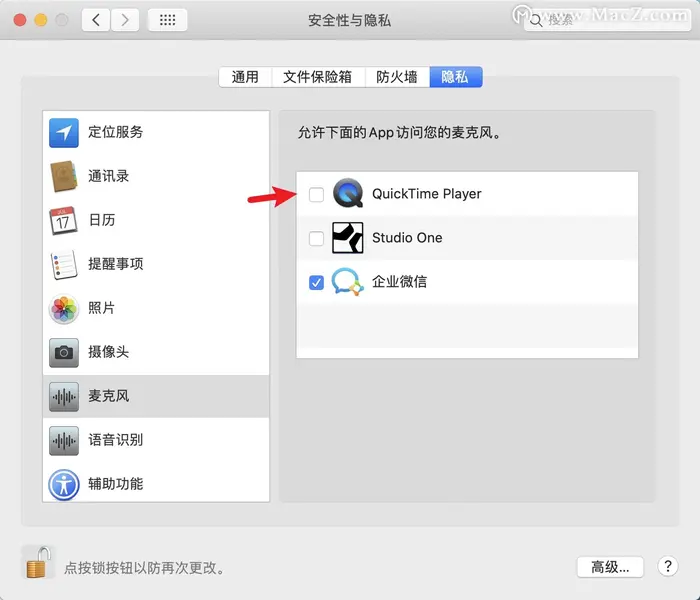 三、 点击隐私,找到左侧摄像头,点击左下角的小锁图标